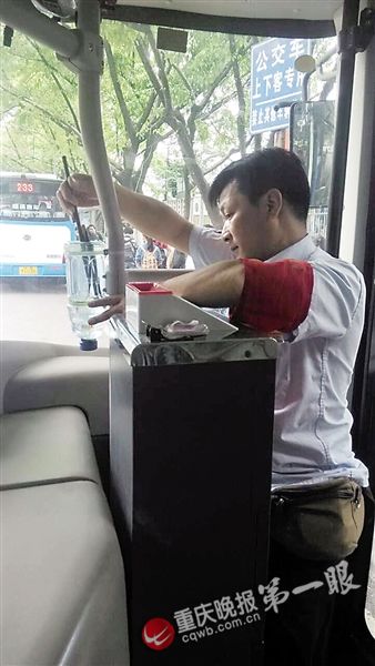 重慶晚報記者從前門上車,一眼就看見門柱上綁一個小號飲料瓶,票箱旁綁著一個大號飲料瓶,瓶子被白色扎帶和膠皮管牢牢系住,瓶口向下,瓶子底部被剪開朝上。大號瓶里有兩條小金魚,正歡快地游著。
