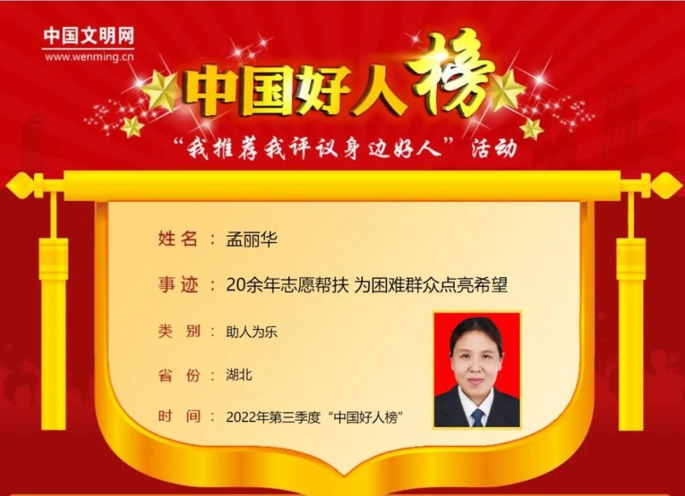 孟麗華,女,漢族,1970年生,中共黨員,荊門市公共交通集團有限公司點鈔中心副主任、荊門市圓夢愛心幫扶會會長。二十多年來,孟麗華通過捐資助學(xué)、扶老助殘、幫扶貧困,將幾十多萬元工資獎金和全部工余時間都用來做志愿服務(wù),把助人當做自己的快樂和幸福,向社會傳遞著溫暖和關(guān)愛。先后獲得全國三八紅旗手、全國孝親敬老之星、湖北省五一勞動獎?wù)?、荊楚楷模、湖北省十大愛心助殘人士、崗位學(xué)雷鋒標兵等榮譽稱號。
