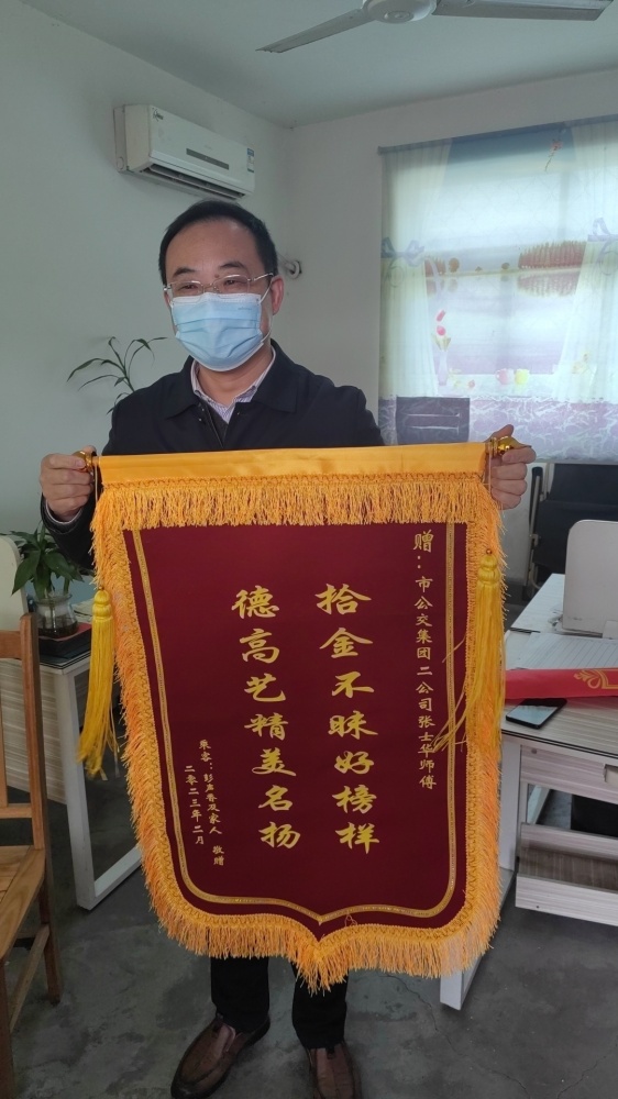 當(dāng)日下午,彭奶奶家人著急的撥通客服電話尋找遺失的物品,工作人員立即幫助其耐心尋找,并給3路線出車的所有駕駛員下發(fā)車載消息。當(dāng)?shù)弥锲芬焉辖还就咨票9芎?,失主委托家人隨即趕到公司調(diào)度室,在仔細(xì)核實后,拿到了自己失而復(fù)得的物品,并將一面印有“拾金不昧好榜樣,德高藝精美名揚”字樣的錦旗送到公交公司,對張師傅表達了誠摯的謝意。