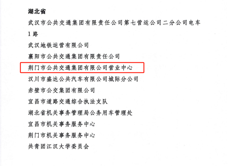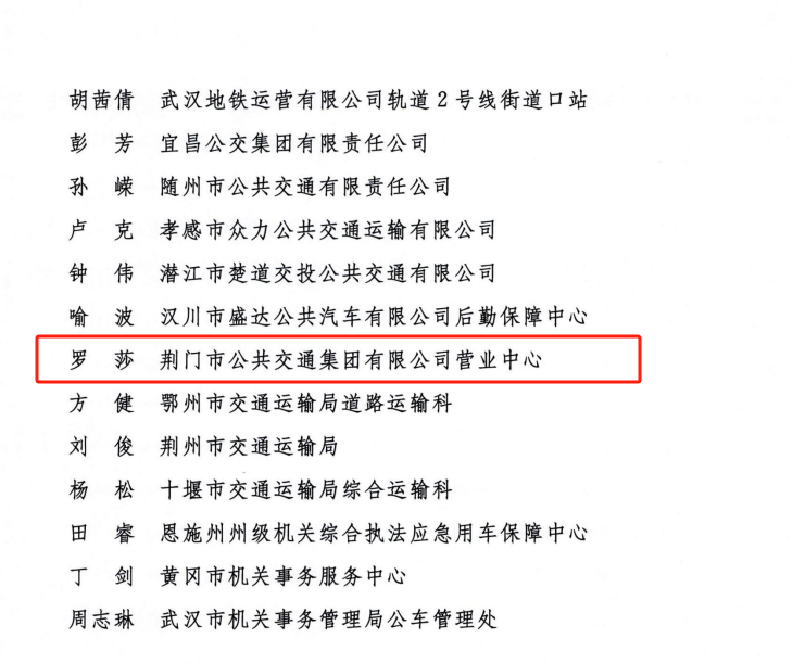 近日,交通運(yùn)輸部、公安部、國(guó)家機(jī)關(guān)事務(wù)管理局、中華全國(guó)總工會(huì)、共青團(tuán)中央聯(lián)合發(fā)出《關(guān)于表?yè)P(yáng)2023年綠色出行宣傳月和公交出行宣傳周活動(dòng)成績(jī)突出集體和個(gè)人的通報(bào)》。其中,荊門市公共交通集團(tuán)有限公司營(yíng)業(yè)中心被評(píng)為活動(dòng)成績(jī)突出集體,荊門市公共交通集團(tuán)有限公司羅莎被評(píng)為活動(dòng)成績(jī)突出個(gè)人。