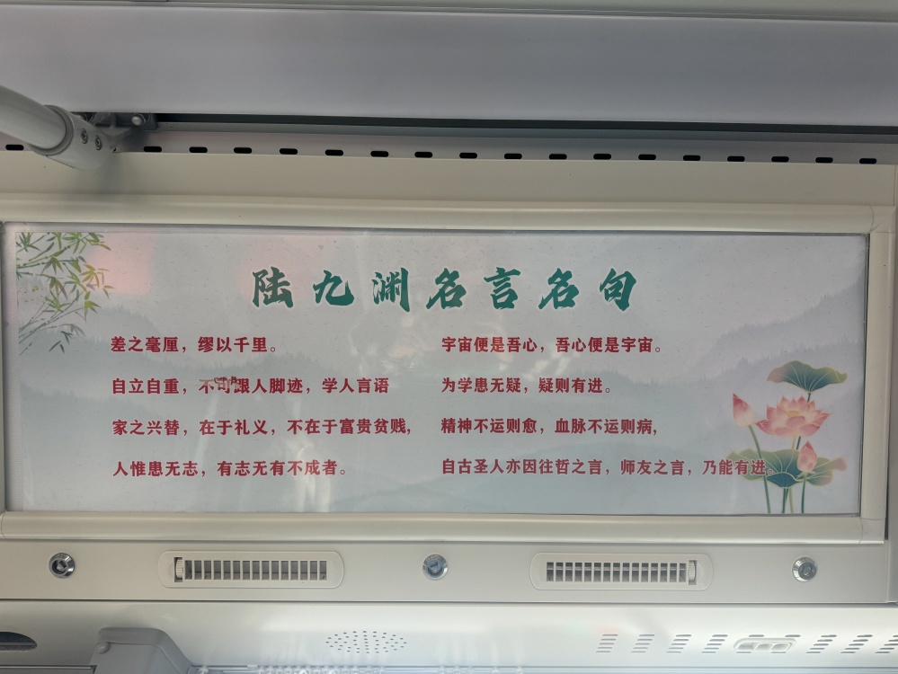 “陸九淵號”不僅僅是一條公交線路,更是一個移動文化陣地。當(dāng)你踏上這趟公交車,你會被駕駛員的熱情服務(wù)所感染,他們微笑著迎接每一位乘客,以優(yōu)質(zhì)的服務(wù)彰顯著荊門的文化精神和城市溫度。車輛全部采用新能源公交車,不僅環(huán)保節(jié)能,行駛起來也更為平穩(wěn),同時,在車輛內(nèi)外裝飾以及“進站、出站、溫馨提示”等場景語音播報融入陸九淵相關(guān)元素,讓乘客潛移默化的加深對荊門文化的認(rèn)識和理解。