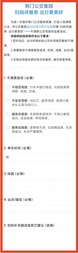 市民乘客可通過(guò)掃描公交車上的“服務(wù)監(jiān)督二維碼”,進(jìn)入“不滿意公交駕駛員監(jiān)督舉報(bào)”頁(yè)面,填寫(xiě)詳細(xì)舉報(bào)信息(評(píng)價(jià)頁(yè)面如下)。
