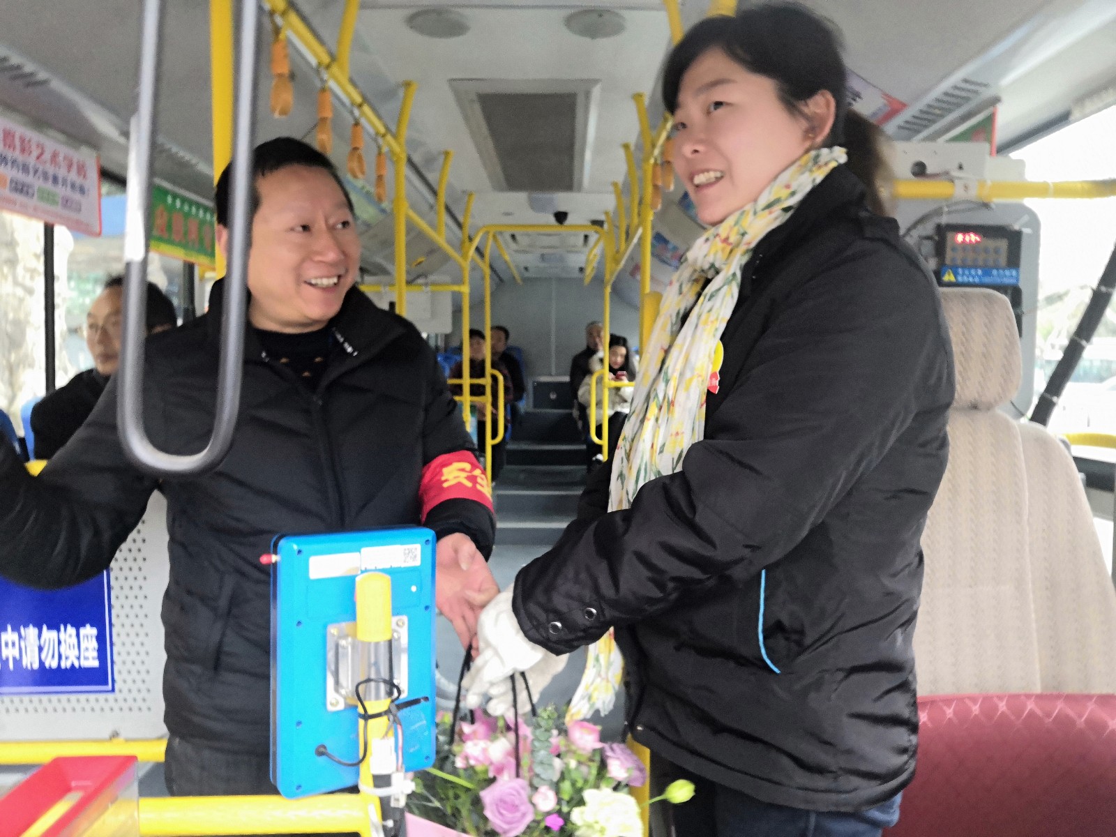 “我代表公司全體男職工,祝你們節(jié)日快樂,永遠(yuǎn)美麗!!這籃鮮花送給你~”公交信息技術(shù)部男職工羅皓這樣說道,并將一籃鮮花送到正在跑班的公交女駕駛員蘇純菊手中。面對這突來的鮮花和祝福,蘇純菊滿臉驚喜和溫馨,“謝謝,謝謝你們”在道謝聲中,關(guān)上車門,微笑著駛向下一站。