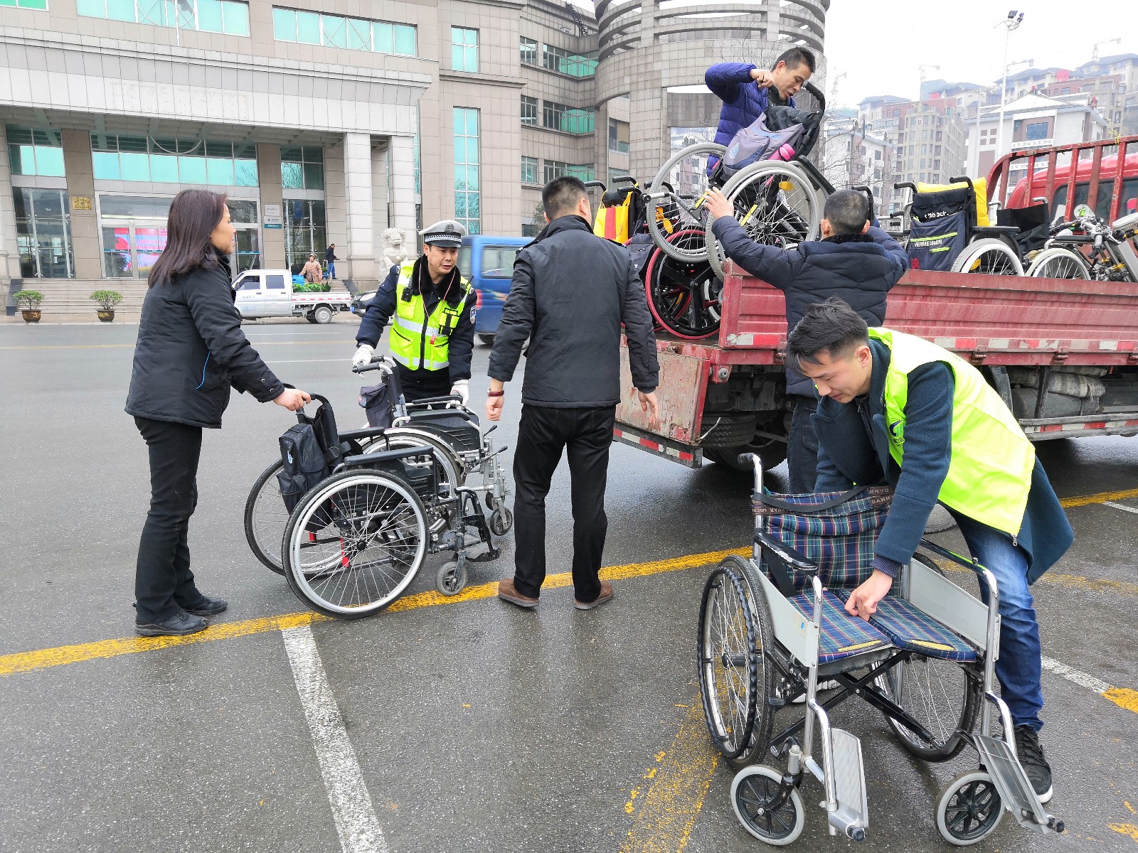 20輛雷鋒車整齊列隊(duì)??浚?5名輪椅人5名盲人朋友在雷鋒的哥和公交志愿者的協(xié)助下安全乘上車,輪椅車統(tǒng)一集中搬運(yùn),開始下一階段活動(dòng),陪殘疾朋友游玩龍泉公園。