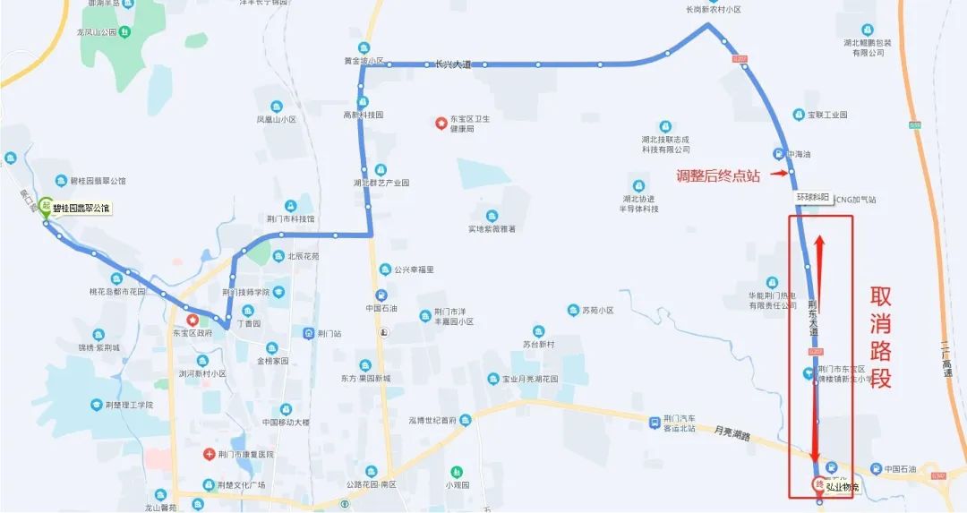 具體為:碧桂園翡翠公館—宏業(yè)物流調整為碧桂園翡翠公館—環(huán)球科陽(荊東大道),暫時取消荊東大道與長崗一路交匯處—宏業(yè)物流區(qū)間路段(具體走向圖見附件)。道路施工結束后即恢復原線路運行。