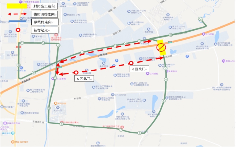 原途經(jīng)荊南大道—龍井大道路段調(diào)整為荊南大道—交通路—高新路—龍井大道